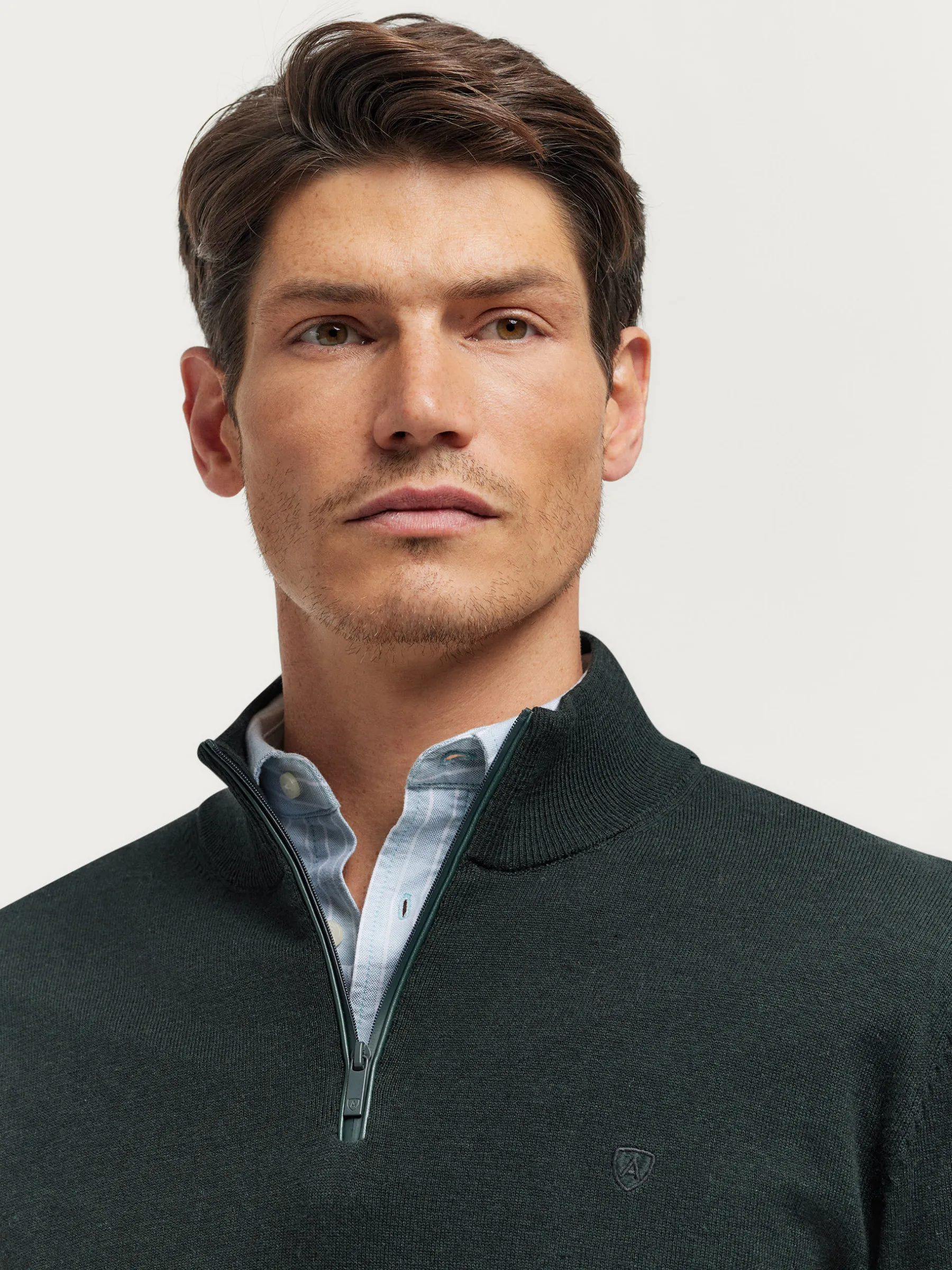 Jersey de corte regular confeccionado en algodón. Cuello alto con medio cierre de cremallera. Logo bordado en el frontal al tono. Cuello, puños y bajo en acabado elástico.