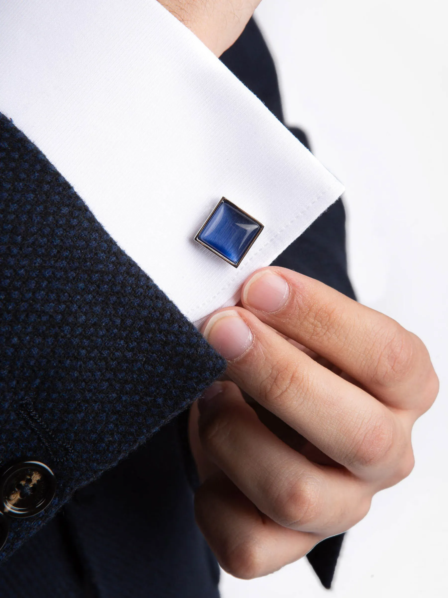 Gemelo metálico de forma cuadrada que cuenta con engarce de madre perla.