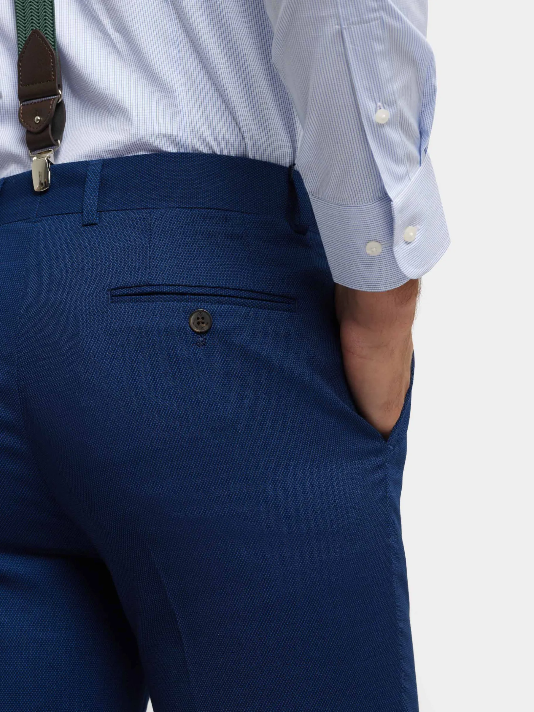 Pantalón de traje en tejido de ojo de perdiz que cuenta con cierre frontal de cremallera y botones, dos bolsillos abiertos en la parte delantera y dos bolsillos traseros con cierre mediante botón. Forrado en su interior.