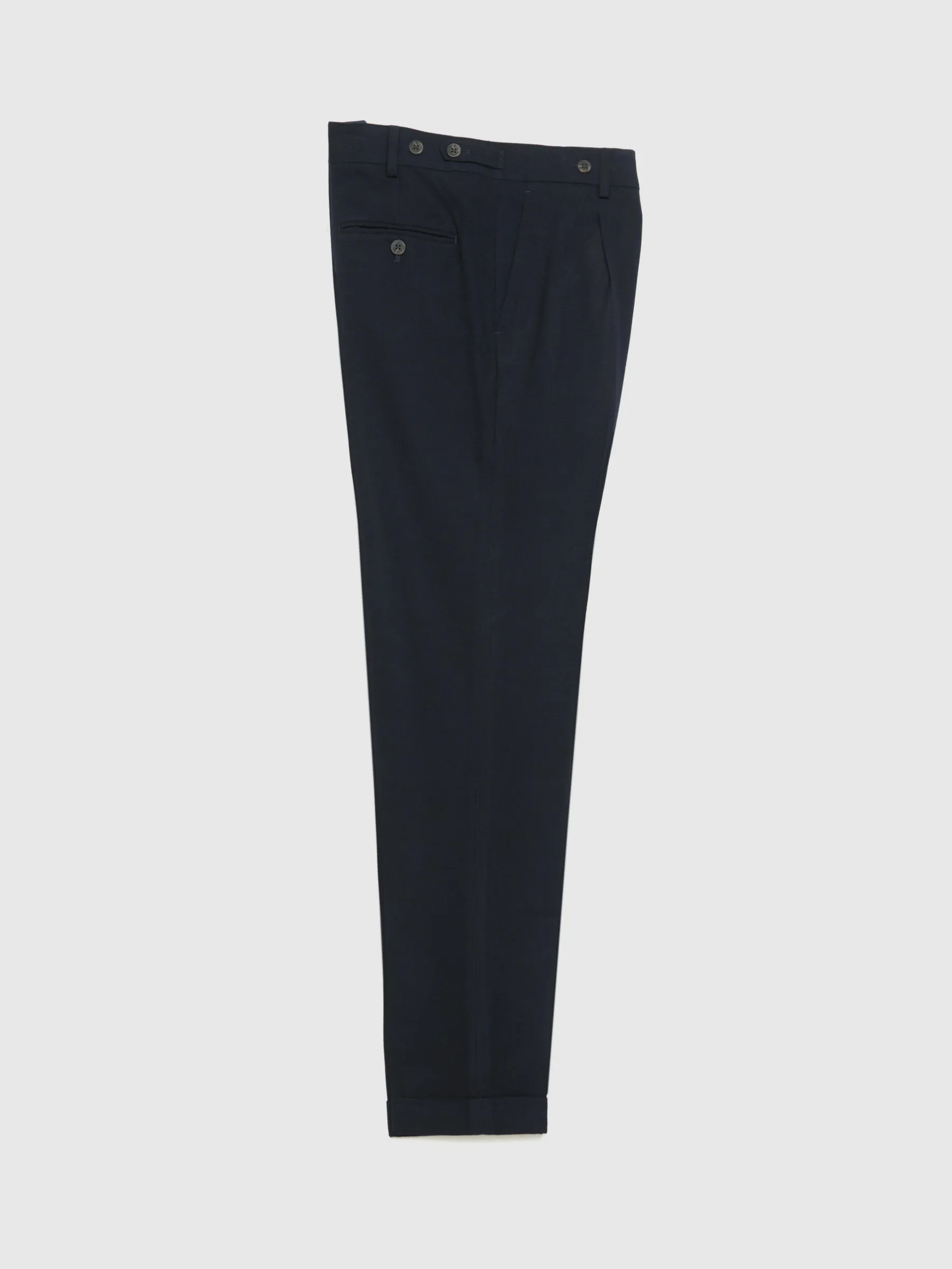 Pantalón de vestir que cuenta con el bajo doblado y pinzas en el frontal. Cierre frontal de cremallera y botones, dos bolsillos en la parte delantera y dos bolsillos traseros con cierre mediante botón. Forrado en su interior.