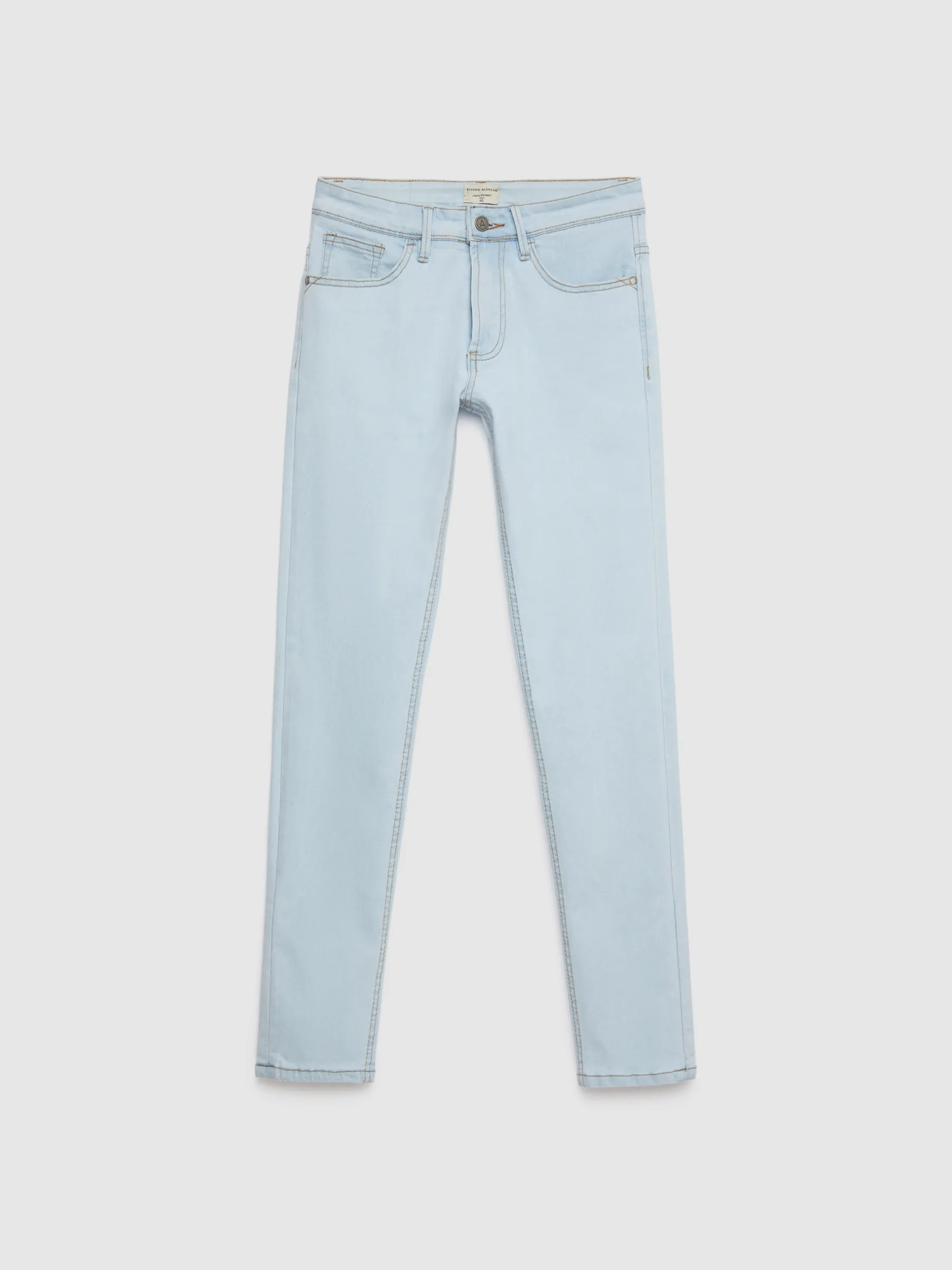 Pantalón denim de corte skinny fit con cinco bolsillos y cierre central mediante botón y cremallera, pespuntes en color camel, fornituras personalizadas y etiqueta en efecto piel en la cinturilla.