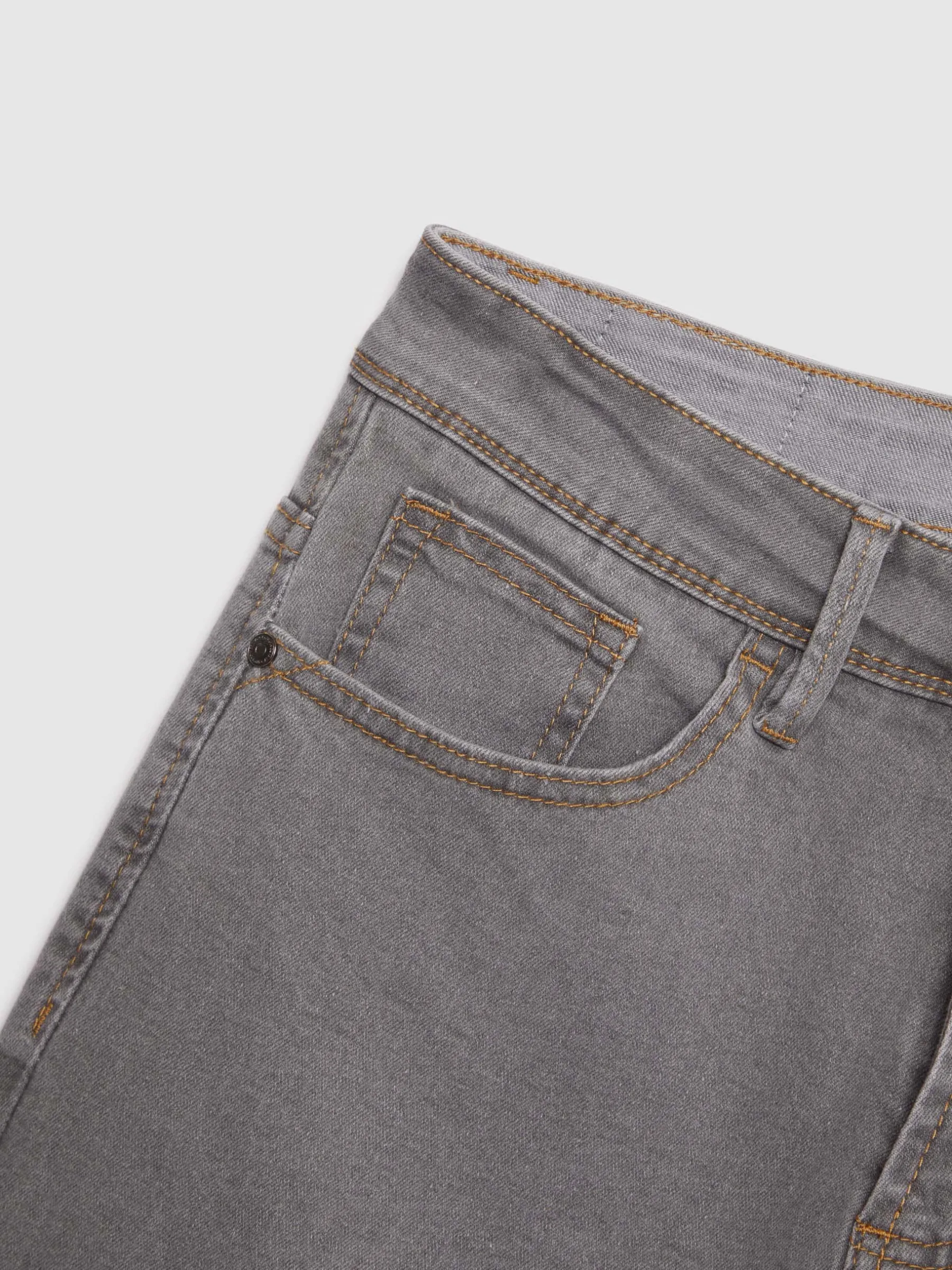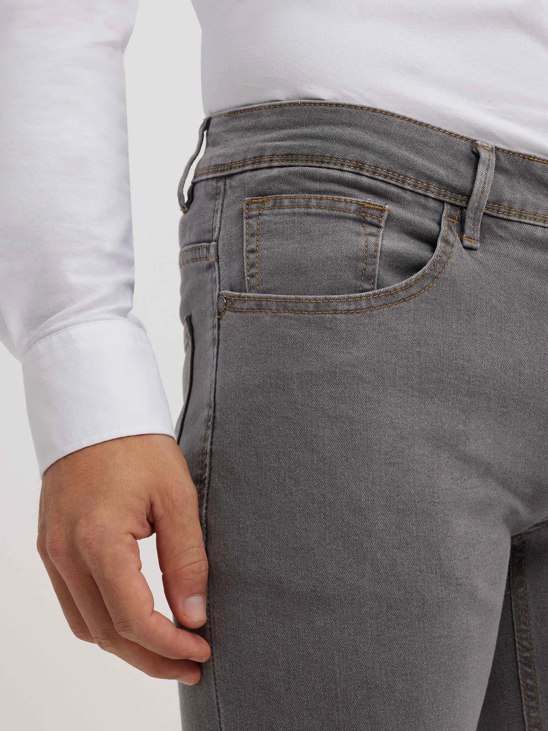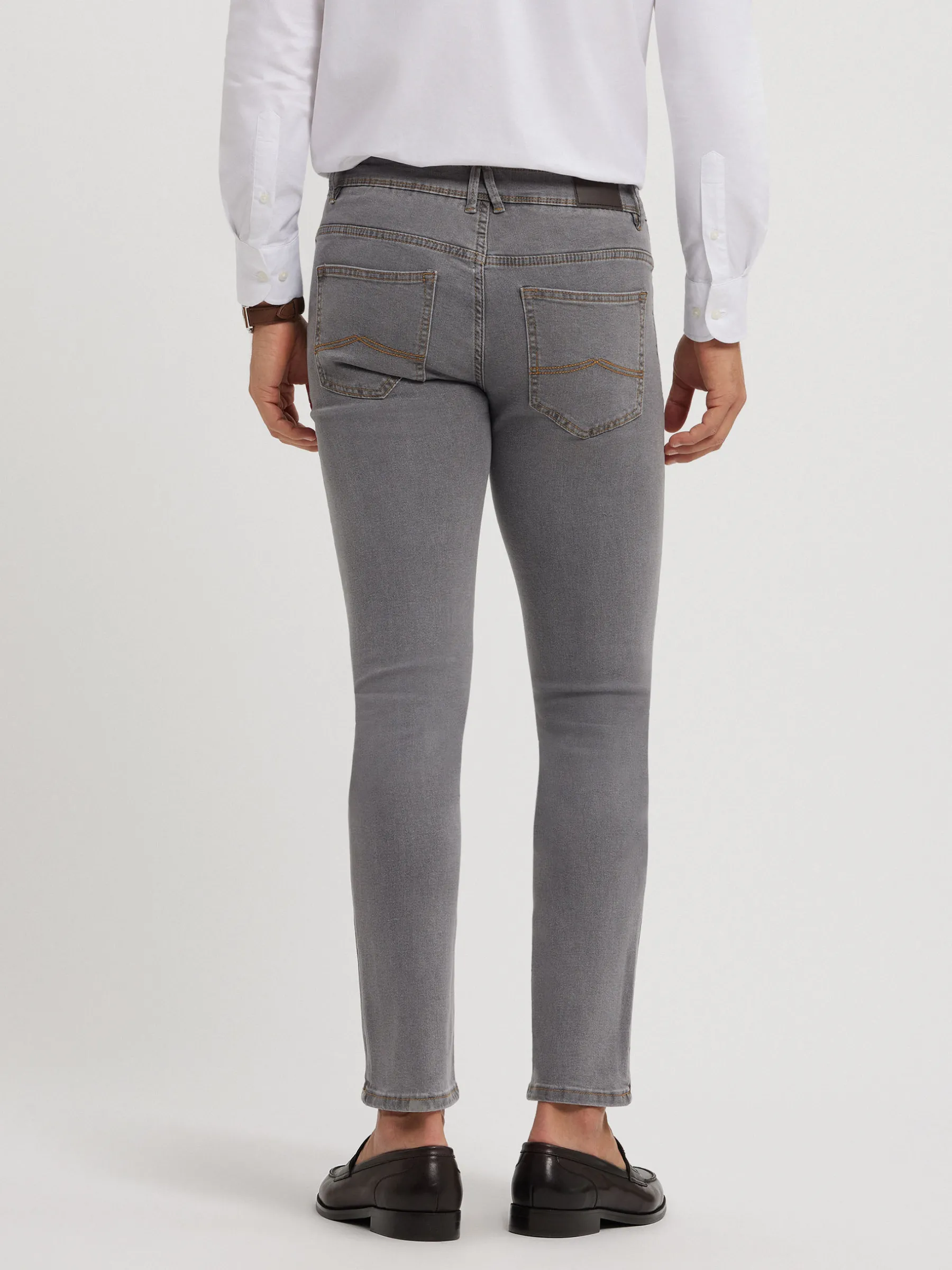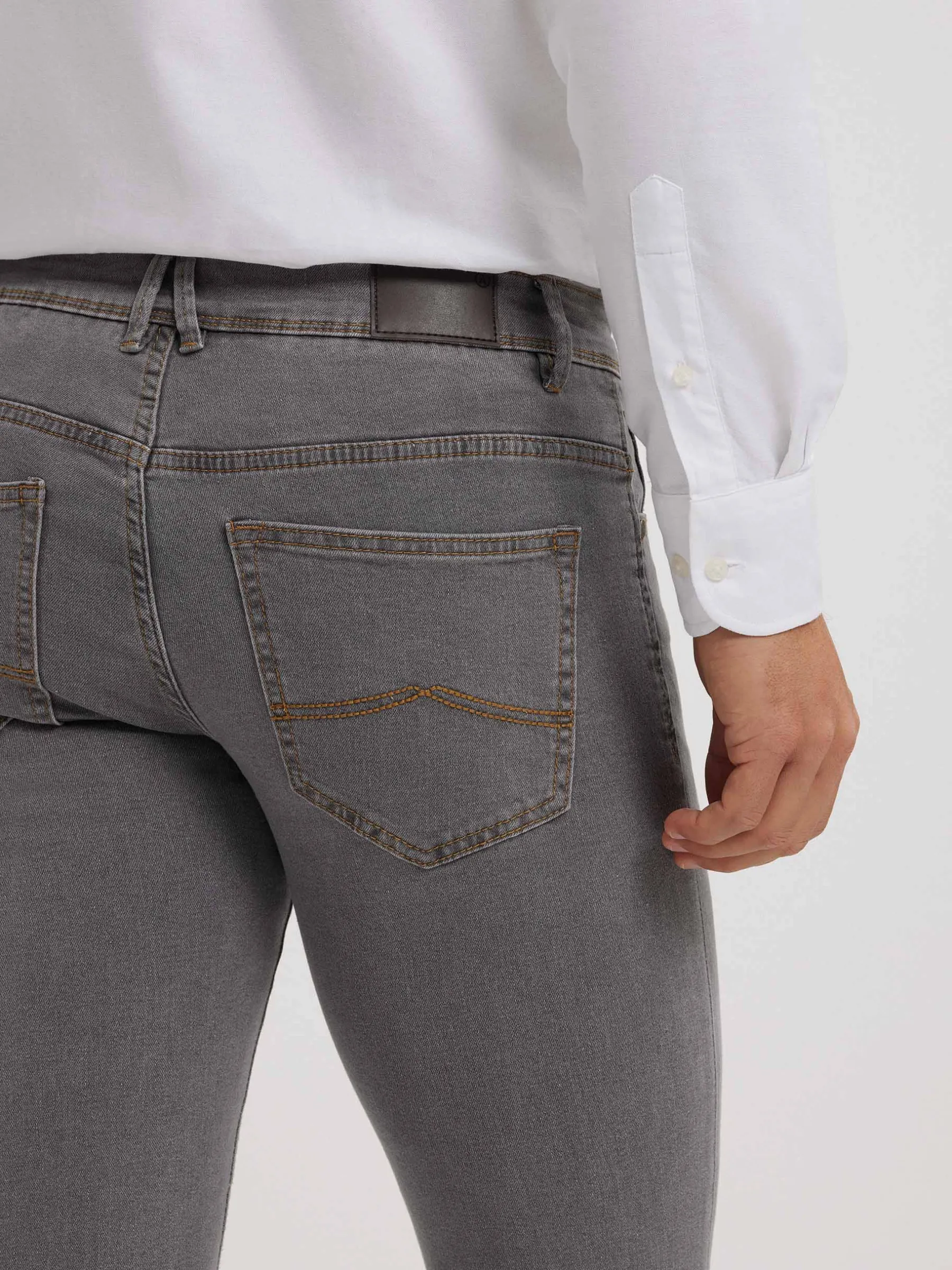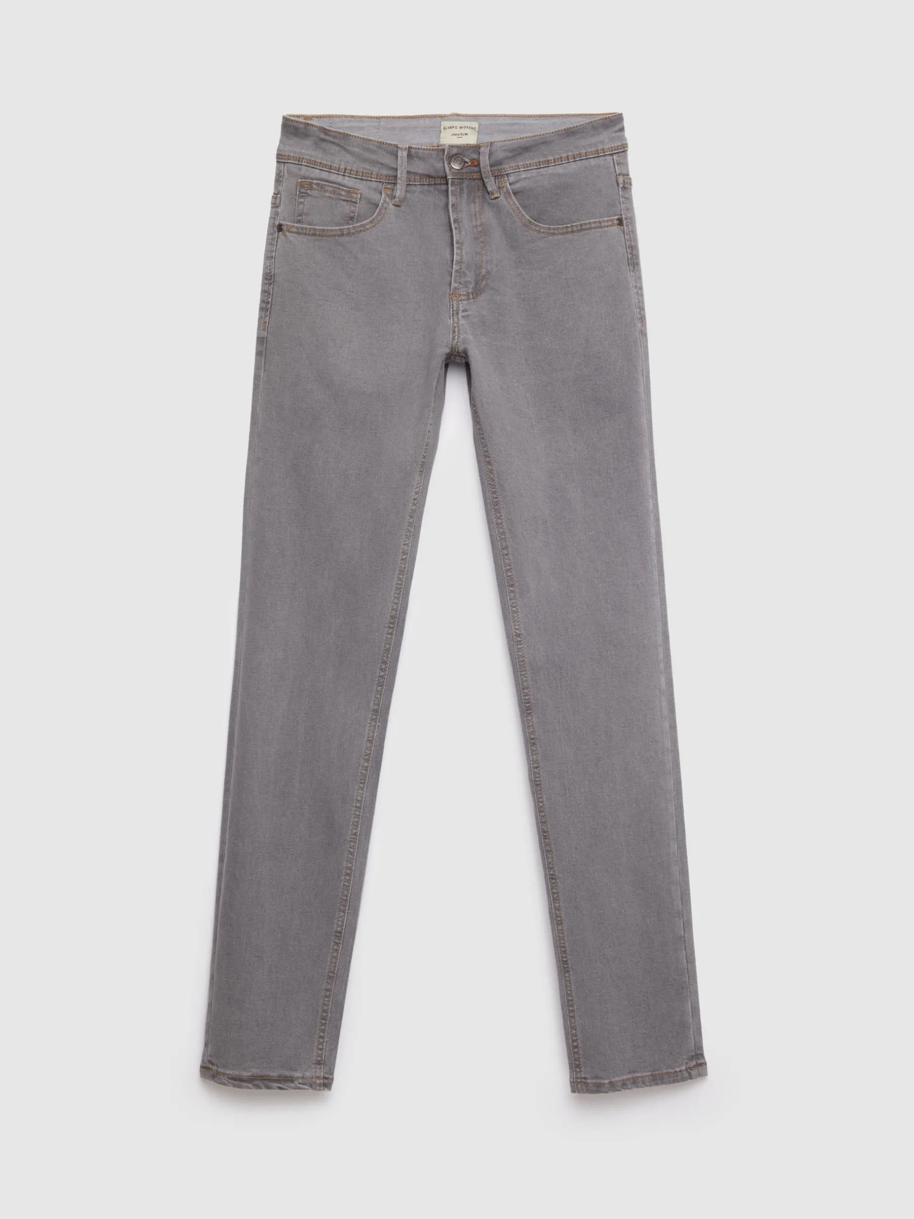Pantalón denim de corte slim fit con cinco bolsillos y cierre central mediante botón y cremallera, pespuntes en color camel, fornituras personalizadas y etiqueta en efecto piel en la cinturilla.